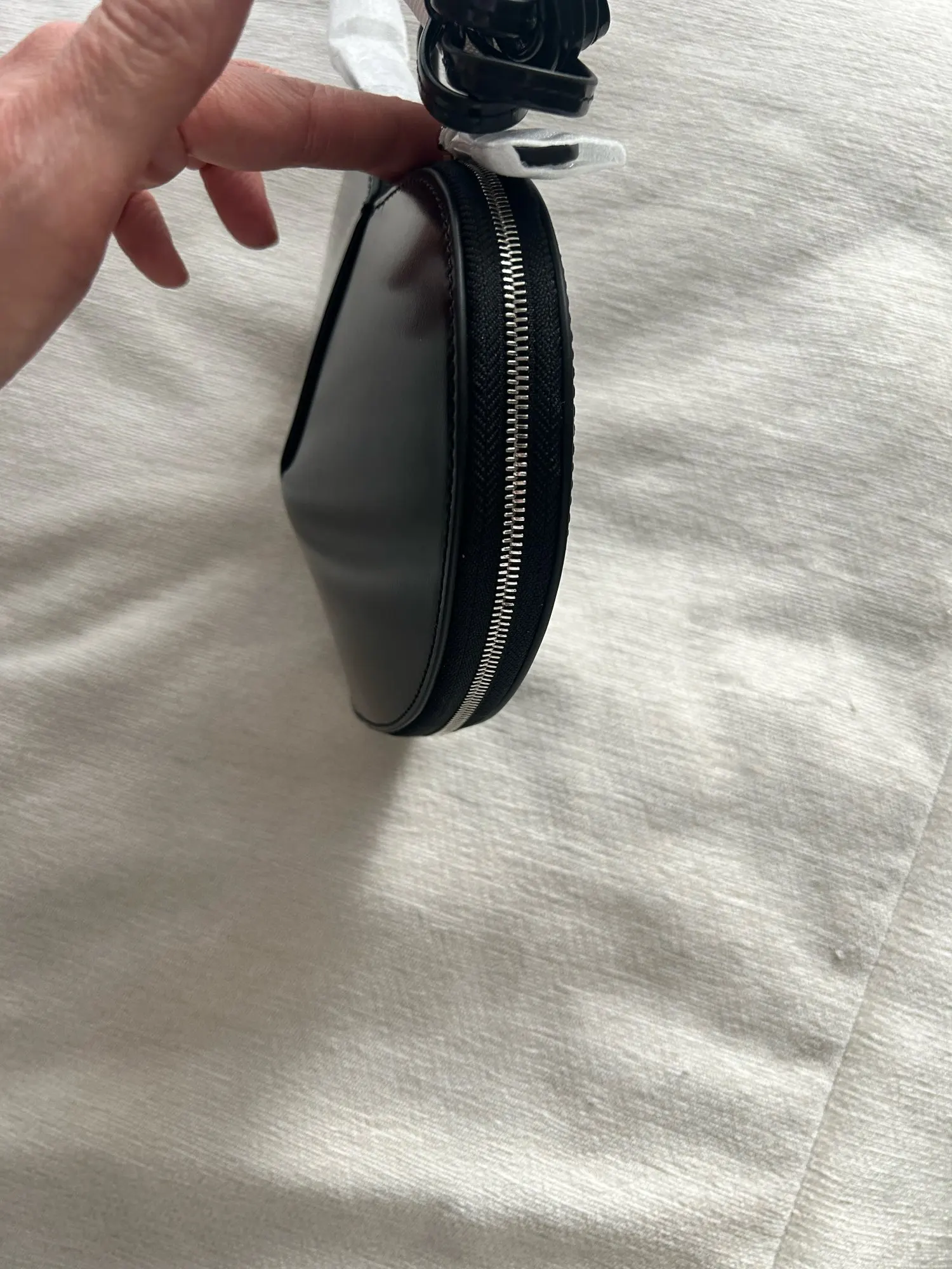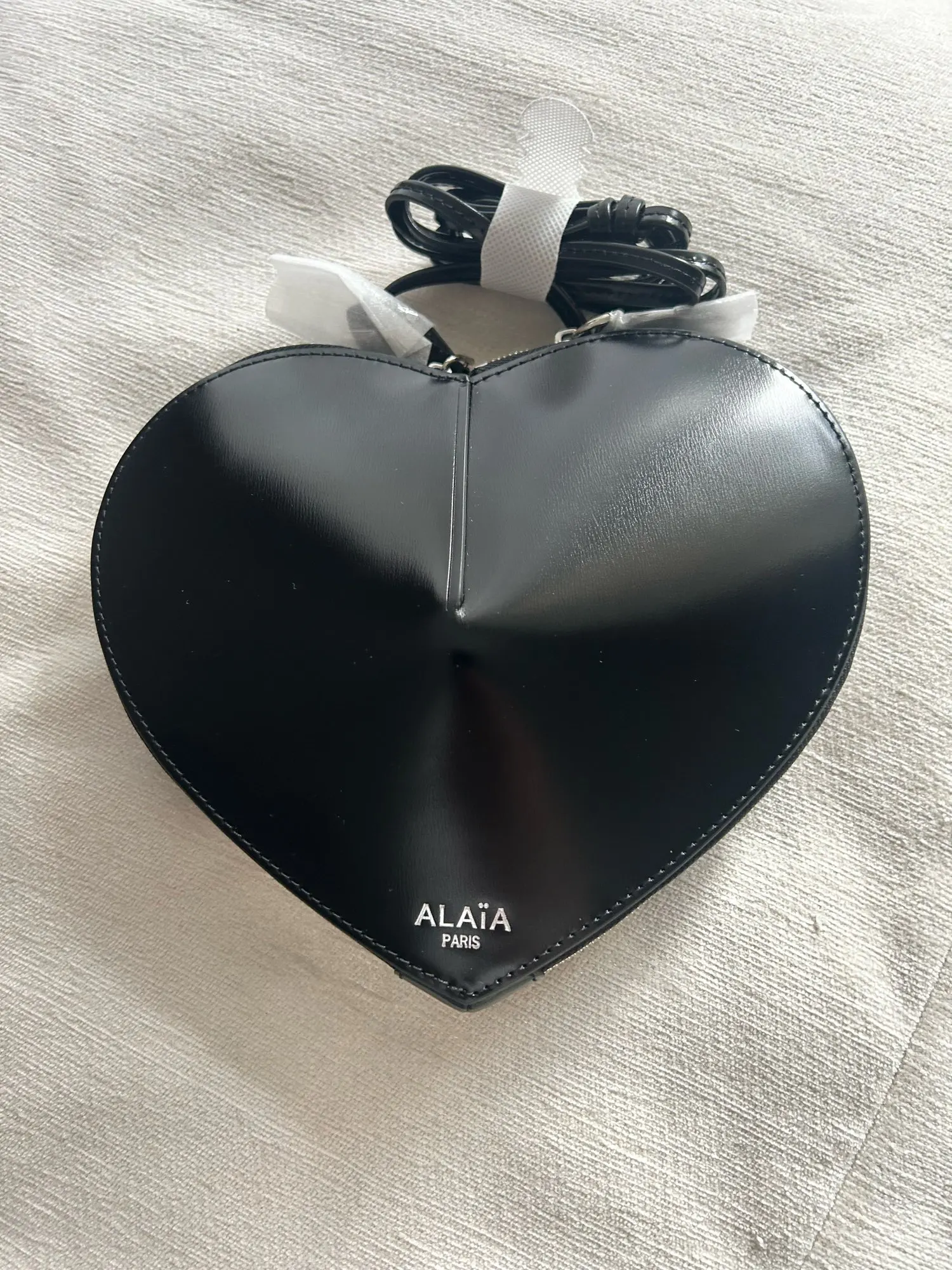 Heart bag, a simple cut in the leather creates volume and pure shape, zip closure, adjustable strap.
